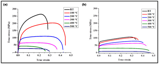 High-temperature tensile tests of the (a) composite and (b) processed without PDC from room temperature to 500 °C. The tensile strength of the composite at 100 °C was two times that of the room temperature strength of metal processed without PDC, along with an increase in ductility of 25%.