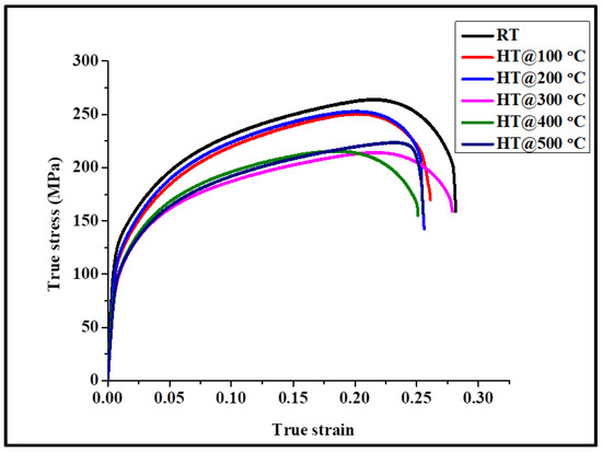 Figure 12 shows the tensile curves obtained at room temperature for samples exposed to temperatures in the range from room temperature to 500 °C for 1 h. It is apparent that there is not much of a loss in strength or ductility even after high-temperature exposure up to 500 °C. The reduction in ultimate tensile strength (UTS) was only 4% after exposure to 100 °C, 17% to 300 °C, and 15% to 500 °C for 1 h. The loss in strength is much higher in commercial high-strength aluminum alloys; for example, in Al7075-T6 alloy, the loss is 50% at 300 °C [37] in contrast to 17% in our material. This is why–in spite of the higher UTS in Al7075-T6–the UTS becomes comparable between the two materials after a 300 °C 1 h exposure: 225 MPa in our material compared to 258 MPa in Al7075-T6. The higher rate of loss in traditional high-strength Al-based alloys with high-temperature exposure is due to precipitate coarsening/dissolution and grain growth.