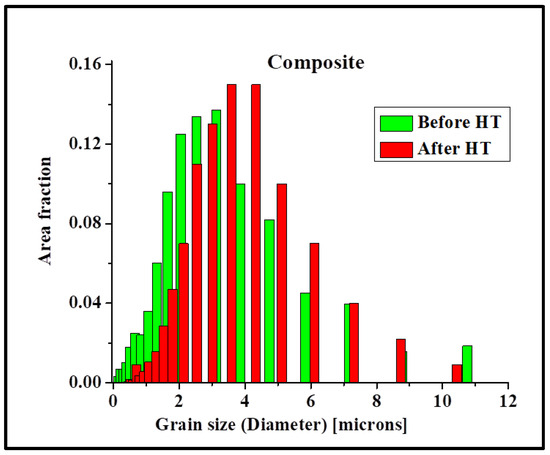 Grain size distribution of the composite before and after heat treatment. The average grain size remained the same; however, individual grains changed their size.