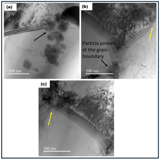 (a): Bright-field TEM micrograph showing particles at the grain boundary (marked with a black arrow). (b,c): grain boundary drag at the particle–boundary interface is seen (marked with a yellow arrow).