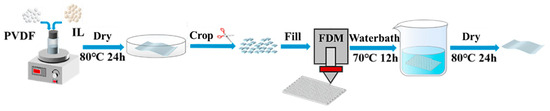 Pure PVDF and its composite films were prepared by FDM, and the preparation process is shown schematically in Figure 1. Samples of 1-ethyl-3-methylimidazolium tetrafluoroborate ([Emim]+ [BF4]−) with mass fractions of 5 wt.%, 10 wt.%, 15 wt.%, and 20 wt.%, respectively were weighed, and mixed homogeneously with N, N-dimethylformamide (DMF) to obtain IL, and the PVDF powder was dissolved in IL to obtain the homogeneous mixed solution. The solution was poured into a petri dish and placed in a vacuum drying oven and dried at 80 °C for 24 h, until the DMF was completely volatilized and the PVDF/IL composite films were obtained.