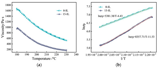 (a) Viscosity–temperature curves of melted PVDF with 0 wt.% and 15 wt.% IL contents; (b) relationship curve for -.