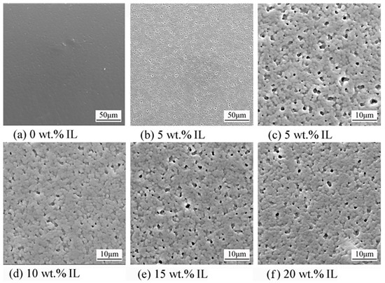 Surface SEM of PVDF/IL composites with different IL additions: (a) 0 wt.%; (b) 5 wt.%; (c) 5 wt.%; (d) 10 wt.%; (e) 15 wt.%; (f) 20 wt.%.