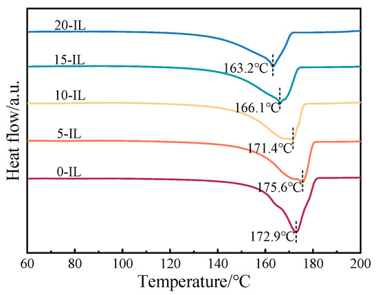 The crystallinity of PVDF/IL composites was further calculated by DSC test analysis, and the DSC curves of PVDF with different IL additions are shown in Figure 8. The melting peak in the DSC curve was named Tm, which was the melting point of PVDF. After the addition of IL, the value of Tm of PVDF increased and then decreased, and a broader melting peak was formed. The Tm value of PVDF without IL was 172.9 °C. After the addition of 5 wt.% IL, a large number of the β and γ phases were generated under the induced effect of IL, and since the melting point of the γ phase was 6–7 °C higher than that of the α phase [3], its Tm value increased to 175.6 °C. With further addition of IL, the content of the generated γ phase decreased. At this point, the polar phases in PVDF were dominated by the β phase. The β phase had a melting point similar to that of the α phase, and IL also acted as a plasticizer in PVDF [8], making it melt easily. Therefore, the value of Tm decreased with the further increase in IL. The decrease in melting point facilitated the realization of melted PVDF direct writing at lower temperatures.