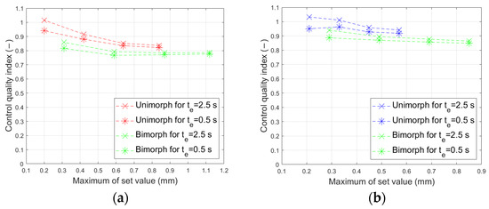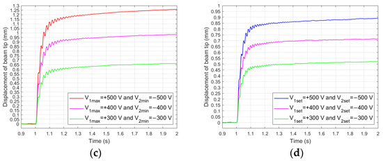 - The use of Bryson’s rule to determine the weights in the R matrix is not sufficient because it leads to the generation of the maximum possible control voltage, for example ±500 V in the case of the equipment presented in this article. This article proposes a modification to the method of determining the weights by introducing the ratios of the Young’s modulus: see Equation (23). For the same purpose, in the Q matrix, the deviation from 0 of the first state variable should be limited by introducing an appropriately large weight q11. Based on the results of the laboratory experiments, the article proposes a weight value q11 equal to the larger value of Young’s modulus (either the Young’s modulus value of the carrier layer material or of the piezoelectric material);