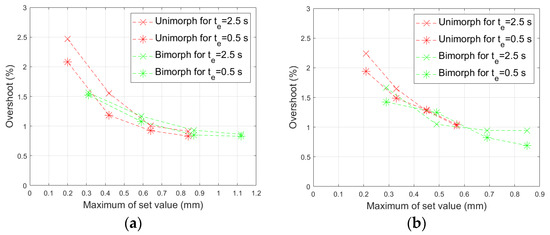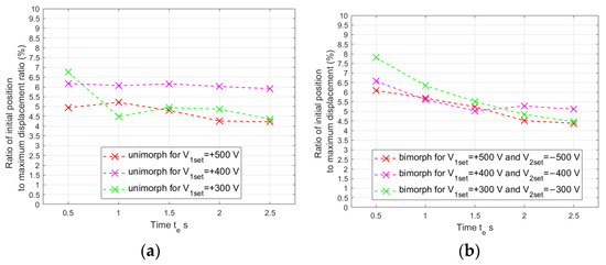 - The control voltage of the compressing MFC should be larger than the control voltage of the stretching MFC. This observation is based on the comparison of the displacements of the unimorph and bimorph for the same carrier layer material.