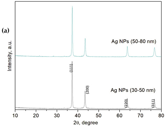 In Figure 1, the Raman spectra of AgNP 50–80 and 30–50 nm are presented. The similarity between the two spectra suggests a similar synthesis method. The bands observed in the spectra of the AgNPs appear broadened, and some shoulders are noticeable, indicating the presence of adsorbed species. Because the NPs are exposed to the atmosphere, several bands are detected. The first signal is identified at 131 cm−1. A detailed study for the identification of Raman bands of silver compounds and surface species has been conducted in the work of Martina et al., and the following attributions will be based on it [39]. Starting from the T’ modes of the Ag+ cation, they are found at 98 (strong) and 146 (shoulder) cm−1, and some ionic silver can be present in AgNPs by comparison with the signal at 131 cm−1 reported herein. The shoulder at 233 cm−1, observed in the spectra of both AgNPs, could be attributed to low amounts of Ag2O by v (Ag–O2) found at 240 (strong) cm−1 in reference sample’s spectrum. The band at 361 cm−1 in the AgNP spectrum could also be assigned to the presence of the silver oxide. Moreover, a silver-related band can be found as a shoulder at 780 cm−1, as indicated by Agarwal et al. [40]. Ag nanoparticles seem to be obtained by the chemical reduction of the silver nitrate solution in the presence of an organic reductant, as suggested by the Raman band at 1047 cm−1, which is the main band in the AgNO3 powder’s spectrum. The Raman spectra of silver sulfate (Ag2SO4) instead shows peaks at 455 and 968 cm−1, which are not observed in the Raman bands of the AgNPs, indicating its absence. The Raman band in AgNPs’ spectrum at 823 cm−1 could indicate the presence of some Ag2CO3, which can be identified in the range 804–853 cm−1 [41]. Additionally, a very broad band is observed at around 1307 cm−1 in both AgNPs’ spectra, accompanied by signals at about 1601 and 1560 cm−1, with the latter being more pronounced in the spectra of the AgNPs with sizes of 50–80 nm. These bands could likely be attributed to the presence of residual carbon because the D and G bands can shift from their original positions, from 1348 and 1580 cm−1 for graphene oxide (GO) [42] to around 1359 and 1601 cm−1 for the nanocomposites.