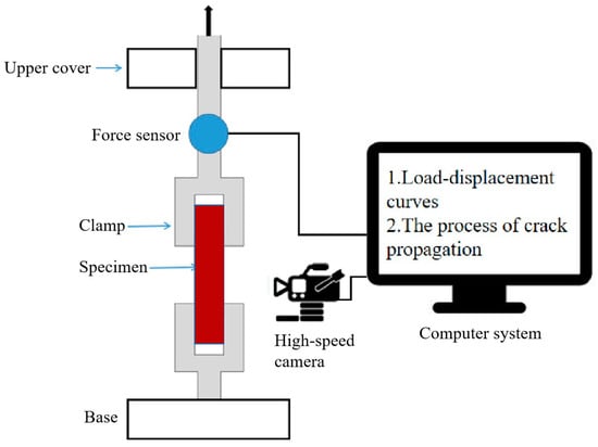 In this paper, a uniaxial tensile machine (SAAS, Zhuhai, China) was equipped to carry out the single-edge notched tension tests. In order to obtain the crack-path morphology and cracking evolution of the NEPE propellant, a high-speed camera was positioned in close proximity to the tensile machine. The force sensor of the drawing machine has a maximum measuring range of 100 N and a measuring accuracy of 0.0001 N. The high-speed camera model is the “Revealer X190” (Fuhuang Junda High-Tech Information Technology Co, Hefei, China), with a maximum frame rate of 9300 fps and a full-frame resolution of 1280 × 1024 pixels. As shown in Figure 2, the tensile machine and high-speed camera are linked to the same computer, enabling the simultaneous triggering of both devices from the computer.