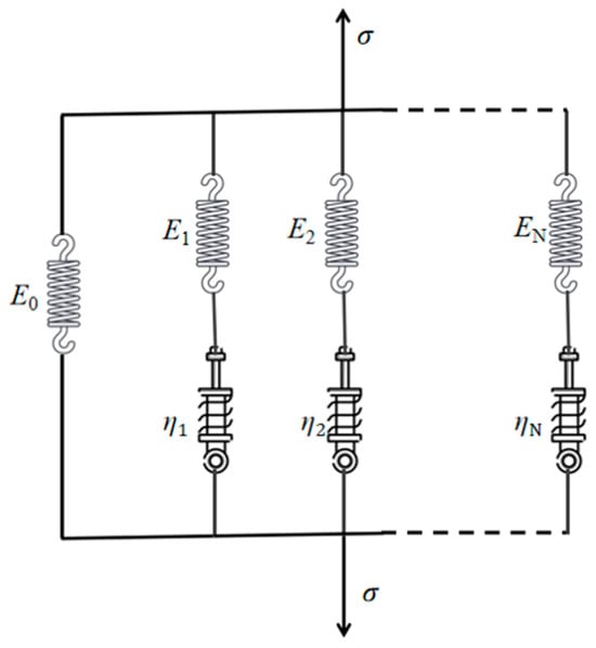 The mechanical properties of isotropic linear viscoelastic materials can be described by the generalized Maxwell model. As shown in Figure 3, this model consists of an elastic element (spring) and n components, which have both an elastic element and a viscous element (damper) in series. In the generalized Maxwell model, the stress relaxation modulus E(t) can be expressed with the Prony series as [30]