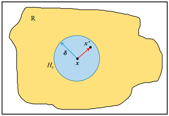 The BBPD method was used in the numerical simulation. It assumes that in the material region R, each material point x can interact with other points x′ within a cut-off distance [32], also called horizon size, as seen in Figure 4, where Hx denotes the horizon of x.