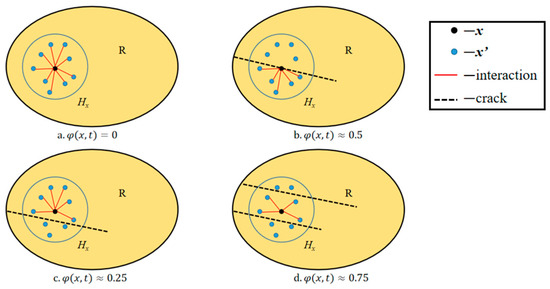 The crack will be formed if the bonds between material points that appear continuous break. It indicates that there is no damage when the value equals 0. When the value reaches its maximum of 1, all bonds in the horizon are broken. The interaction of material points after crack formation is shown in Figure 6.