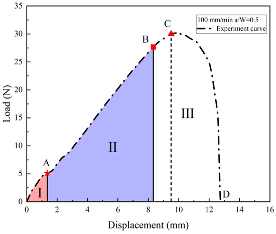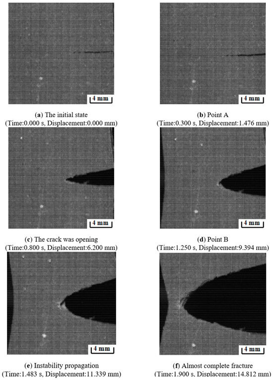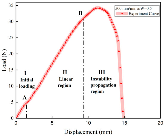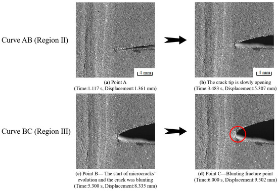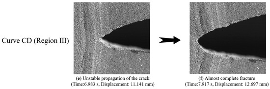 The primary focus of the investigation was the behavior of the crack tip in region III of the displacement–load curve, and the magnification of the high-speed camera was increased to focus on the crack tip rather than the entire specimen.
