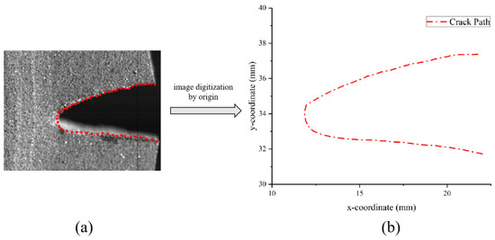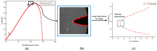 Image digitization processing of crack path: (a) load–displacement curve; (b) image digitization and crack feature point selection; (c) output the feature point coordinates in origin.