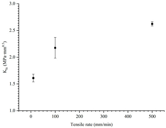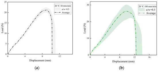 This study conducted SENT tests at three different tensile rates (10, 100, and 500 mm/min) with the same initial crack length (a/W = 0.5). The load–displacement curves of the specimens under the three tensile rates are presented in Figure 10a–c, respectively. Each curve represents the average value, while the shading behind each curve illustrates the error produced in repeated experiments. Figure 10d shows the average value of the load–displacement curves in the range of 10–500 mm/min tensile rates. In all cases, the characteristics of the load–displacement curves are found to be quite similar, which is consistent with the findings obtained using other propellant samples [9,13]. The results of the experiment indicate that the strength of the NEPE propellant increases as the tensile rate increases. The tensile fracture toughness of NEPE propellants exhibited a notable increase when the tensile rate was elevated from 10 mm/min to 500 mm/min.