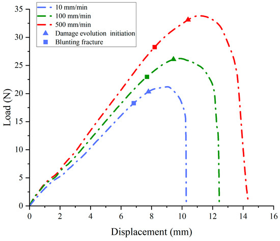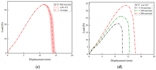The relationship between load and displacement under different tensile rates: (a) 10 mm/min; (b) 100 mm/min; (c) 500 mm/min; (d) average load–displacement curves.