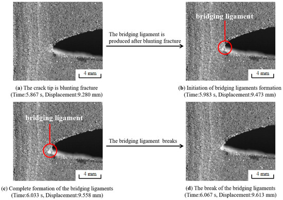 The behavior of the crack tip during the fracture process of the NEPE propellant specimen was recorded by the high-speed camera system and then analyzed. As shown in Figure 15, a large number of bridging ligaments will be formed at the crack tip after blunting fracture in region III. Subsequently, the bridge ligaments break, causing micro-cracks and micro-voids to merge with the main cracks, resulting in macroscopic crack propagation in the propellant. However, new bridging ligaments will be generated at the same time of fracture. When the propellant is completely broken, there will be no remaining bridging ligament at the crack tip. This means that the generation and destruction of bridging ligaments occur throughout the entire process of crack propagation, as shown in Figure 16. The above results indicate that the formation of bridging ligaments is a prerequisite for macroscopic crack propagation. The fracture process in the NEPE propellant involves alternating blunting fracture and crack propagation at the crack tip. In other words, crack propagation and suppression exist simultaneously. As the bridge ligaments always form before breaking, the blunting of the crack always precedes propagation. Therefore, the propagation of the macroscopic crack is not a completely continuous process, with the instantaneous speed of crack propagation also fluctuating. Similarly, Wang’s research demonstrated that crack growth in the HTPB propellant also occurs through a blunt–growth–blunt–growth mechanism of extension, which is highly nonlinear [13].
