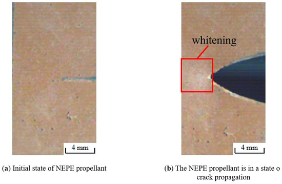 Wang’s study [38] indicates that blunting fracture is a phenomenon exclusive to the HTPB propellant, but the aforementioned study demonstrates that the NEPE propellant also exhibits an obvious blunting phenomenon during the crack propagation process. In previous studies, many scholars have monitored the fracture process using high-speed digital cameras and studied the crack characteristics with video imaging systems [9,12,39,40]. However, the video imaging system alone lacks accuracy, and thus one of the focuses of this study is to combine the video imaging system with image digitization technology in order to study the crack characteristics with the aim to improve the accuracy of the analysis.