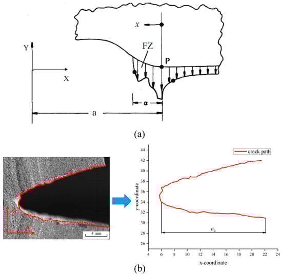 Schematic diagram of “apparent crack tip”: (a) crack tip P and the failure zone [45]; (b) method of obtaining the length of “apparent crack tip”.