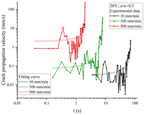 The relationship between crack propagation velocity along the x-direction and time under different tensile rates: experiment curves and fitting curves.