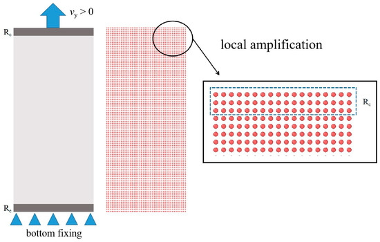 In PD theory, when the elongation s between two material points exceeds its critical value sc, the bond will break; the critical stretch sc depends on the critical energy release rate Gc of the material, and sc can be expressed as (in this study, E is the current Young’s modulus at time t). The force between two material points of matter in the equation of motion will disappear forever when damage occurs. In order to visualize the damage behavior of the material, the damage function is introduced [34]:
