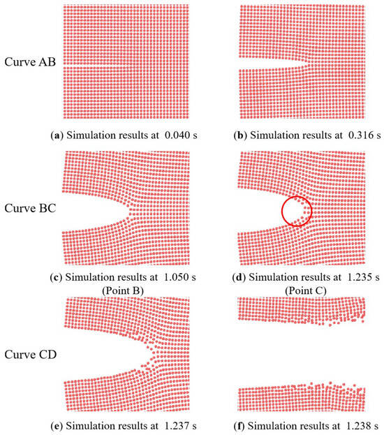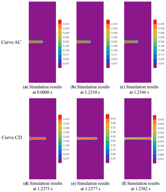 As shown in Figure 11, regions II and III of the load–displacement curve were separated by four nodes, ABCD, and the crack tip behavior characteristics were studied for each curve. Curve AB in Figure 11 corresponds to Figure 12a,b, which represents the initial stage of stretching with minimal crack propagation. Then the NEPE propellant material entered the process of “damage evolution and crack propagation”, which corresponded to Figure 12c,d and the BC curve in Figure 11. At this stage, the elastic stiffness of the material began to decline. In contrast to the AB section of the curve, the crack opening displacement in this region increases significantly, but the crack tip’s propagation distance in the x-direction remains short. Therefore, the energy input into the system through the tensile load is primarily dissipated by the deformation of the propellant material. Additionally, the crack tip of the NEPE propellant exhibits significant blunting at this stage.