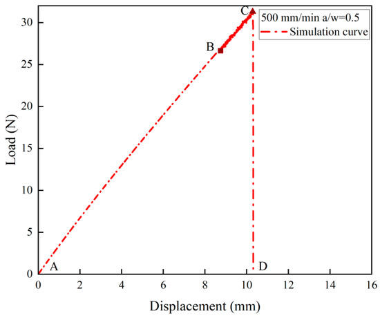 Figure 13 shows the image digital processing of the crack path when the NEPE propellant is positioned at point C on the curve using origin software. At this time, the crack tip is obviously blunted, and point C represents that the crack tip has reached the blunting limit, which is referred to as the blunting fracture point [41]. The load corresponding to the blunting fracture point is designated as the critical load. The study of blunting fracture by scholars indicates that prior to the attainment of the critical load, the crack tip is only blunted, and the crack cannot be propagated while the fracture cannot be triggered [42]. This is consistent with the results observed in this experiment. Figure 14 illustrates the average load–displacement curves under different loading rates. It can be observed that an increase in loading rate leads to a higher critical load. The critical loads of the NEPE propellant tests under the three loading rates are 20.326 N, 26.085 N, and 33.114 N, respectively. It is well established that NEPE propellants are subject to a variety of loads over their operational lifetime, and cracks can develop in propellants. However, the development of cracks in the propellant does not necessarily indicate the end of its useful life. It is possible to extend the service life of the NEPE propellant by controlling the load to below the ultimate load.