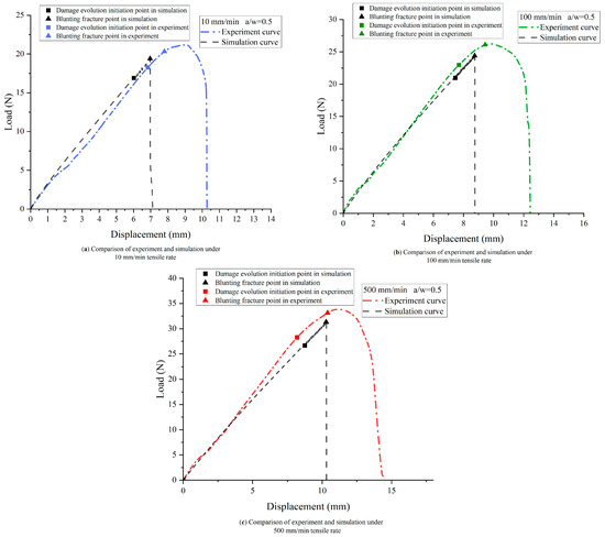 Comparison of experiments and simulations under 500 mm/min for crack propagation velocity.