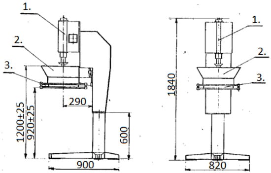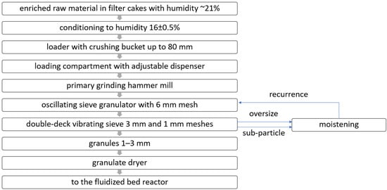 Due to the fact that the primary clay material consists of sub-fine particles (less than a dozen or so µm), which are impossible to fluidize, an innovative solution was decided on in this study, which involved the prior preparation of clay granulates. The block diagram for the production of granules for testing is shown in Figure 1. In the granulation process, it is required that the enriched raw material has a standardized moisture content within a narrow range, i.e., 16 ± 0.5%. In order to ensure such humidity, the filter cakes of the enriched raw material obtained in the filtration process of the suspension of the enriched clay raw material were conditioned in atmospheric conditions and, after obtaining the required humidity, were pre-crushed in a semi-technical hammer mill with a diameter of 800 mm, which was equipped with a 16 mm escape partition. The pre-crushed raw material was then granulated on a sieve granulator, as shown in Figure 2. The reciprocating rotary granulator consisted of a base column on which the reciprocating rotary mechanism was mounted (1) and also a bowl for the pre-crushed raw material for granulation (2), vertically adjustable within ±25 mm in relation to the reciprocating rotary grinder with a ring and (3) the mounting of the grinding screen.