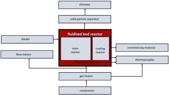 Experimental tests on calcination were carried out at the station described in [36]. For individual tests, the appropriate homogeneous mixtures of raw clay granules and selected ones with different particle size and mass fraction were prepared. The design of the laboratory station enabled fuel to be introduced simultaneously with the clay material through a feeder located in the upper zone of the main reactor, as shown in Figure 5. The total time of fluidized bed calcination, i.e., the time of the mixture in the main chamber of the reactor, was set at 16 min based on previous tests because for this time, a calcination degree of >95% was achieved for different clay granulates.