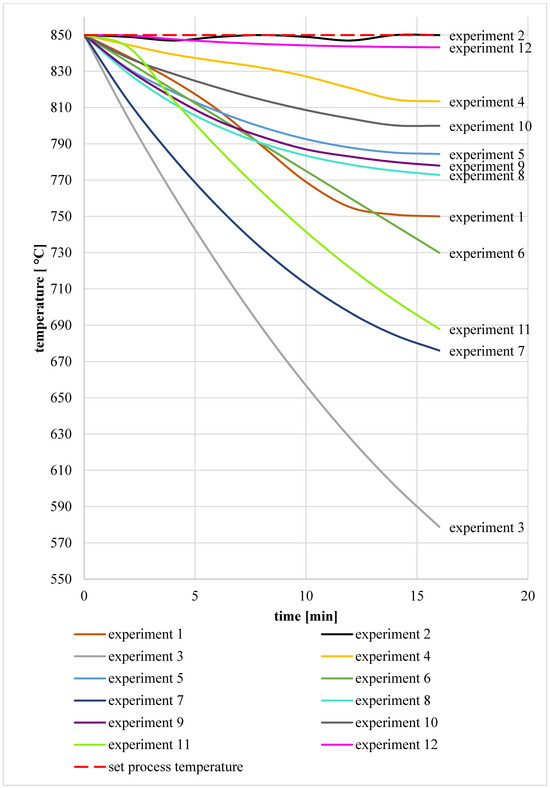 In order to control the calcination and fluidization process during the experiments, the temperature was measured in the main chamber of the reactor and the structure of the layer was observed during the process through sight glasses placed in the wall of the main chamber of the reactor. The recorded temperature courses in the reactor chamber during the calcination processes are shown in the chart, namely, Figure 7. After each experiment (both with electric power and with the use of fuel), the calcination loss and the degree of calcination were determined. The results of these determinations are presented in Table 6. Additionally, the table shows the actual fluidization velocity measured during the process and information about which power sources of the station were turned off during the experiment.