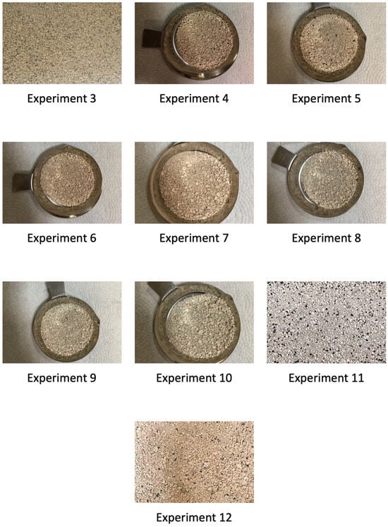 The next three tests (no. 8, 9 and 10) were carried out using hard coal type 31.2. In the case of experiment no. 8, due to the lower ignition temperature of the particles of this type of coal [39], a different particle size range was established than in the case of anthracite. The particle size was 0.75–2 mm and the fuel content was 13% of the mixture. During the experiment, the temperature in the main chamber initially decreased, as in previous tests. The lowest temperature recorded was 772 °C. A small amount of unburnt carbon was observed in the material after calcination, which is indicated in Figure 8, and the degree of the calcination of the material was 96.41%. Searching for the reasons for the temperature drop in the first minutes of the experiment, it was decided to reduce the particle size, thus shortening the ignition induction time. The particle size of hard coal in subsequent experiments was in the range of 0.75–1.6 mm (as in the case of anthracite 1). Additionally, due to the fact that the calculations of the minimum fuel demand did not take into account the heat losses in the process through radiation, it was decided to increase the share of coal from 13 to 15% in test no. 9 and then from 15 to 17% in test no. 10. As a result, the lowest recorded process temperatures were 778 °C and 813 °C, respectively. The presence of unburnt fuel in the material after calcination was not observed, as illustrated in Figure 8. For both cases, a very good result of the material calcination degree was obtained at the level of >99%.