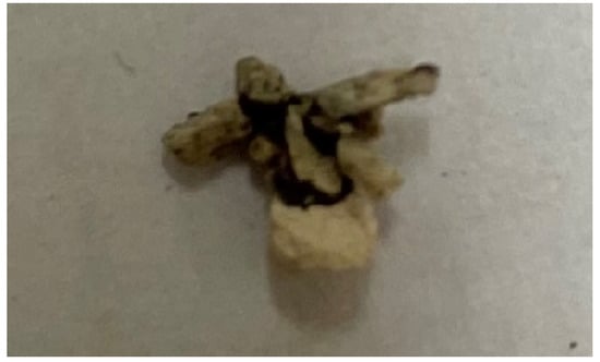 In the final stage of the experimental research, the station was fed with anthracite 2. In the case of test no. 11, the station was fed with anthracite 2 with a particle size of 1–1.6 mm. Due to the positive effect of increasing the fuel share on the calcination process, the carbon content was set at 17% in experiments no. 9 and no. 10. Despite the previous positive effects obtained by increasing the fuel share compared to the value calculated during experiments with hard coal (experiments 9 and 10), contrary to expectations, this time, the temperature in the main chamber decreased. Shortly after starting the experiment, there were problems with maintaining a stable fluidization process and problems with the feeder operation. After a while, the defluidization of the deposit was observed. A significant amount of unburnt coal particles, agglomerates and sinters were observed in the material after calcination, as shown in Figure 8 and Figure 9. Based on the analysis, it was found that the agglomerates were produced as a result of the release of tar substances on the anthracite surface at a temperature below the fuel ignition temperature [50]. The determination of the loss on ignition in the case of test no. 11 confirmed that the calcination process took place to a small extent only in the initial phase of the experiment. The degree of calcination was only 36.34%. In the case of test no. 12, due to the failure of experiment 11, the size of coal particles was reduced and the share of coal in the mixture was reduced to limit the formation of a large amount of agglomerates, which led to the defluidization of the bed. The input material was a mixture of clay material and anthracite with a particle size of <1 mm, where the carbon content was 15% of the mixture. In this case, the temperature in the main chamber remained at a level close to the set process temperature. A small amount of unburnt carbon particles was observed in the material after calcination, as indicated in Figure 8. The degree of calcination was 93.76%.
