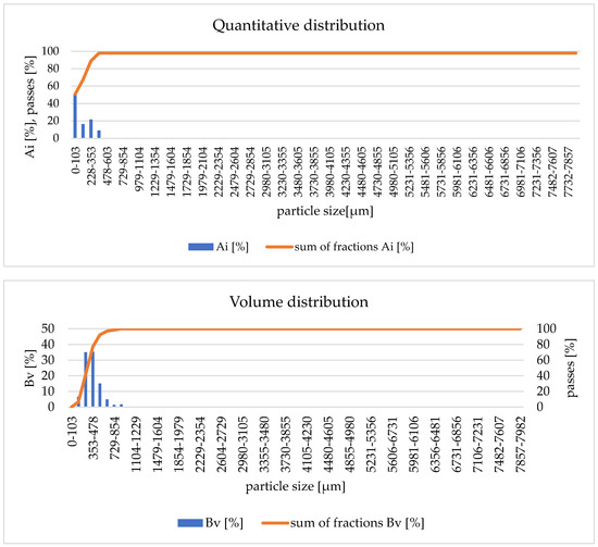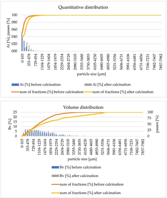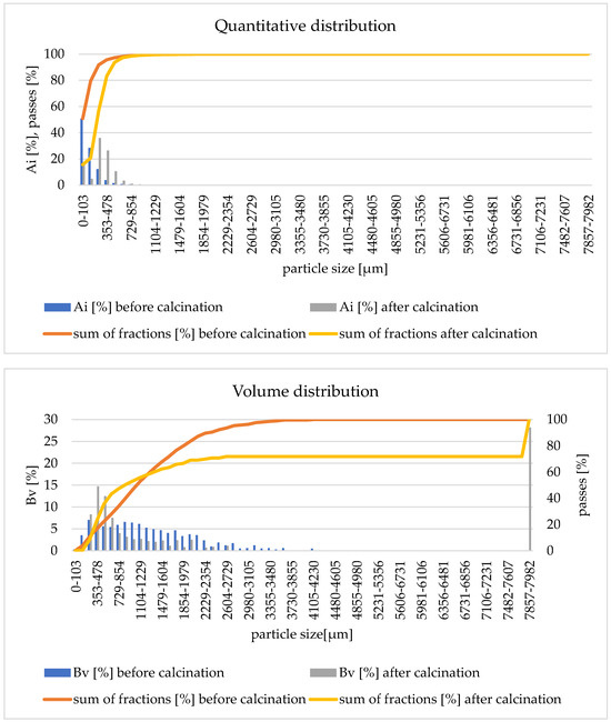 The final stage of research verifying the calcination process was the comparison of the particle distribution of the raw material before and after the calcination process. An example of the quantitative and volumetric distribution of granules before and after the calcination process is shown in Figure 10.