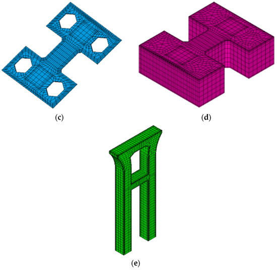 Finite element model. (a) Overall finite element model; (b) concrete pile finite element model; (c) cushion finite element model; (d) abutment finite element model; (e) pier finite element model.
