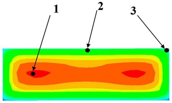 To study the influence of surface heat dissipation coefficients on the early-age temperature field and stress field of different parts of the structure under different ambient temperatures, this study selects a key point inside the structure (Point 1), one on the surface plane (Point 2), and another on the edges (Point 3) for analysis, as shown in Figure 4. According to temperature data, the monthly average temperatures for April, October, May, and July are 14.3 °C, 18.3 °C, 21.7 °C, and 28.8 °C, respectively, showing a relatively uniform gradient. Therefore, this study uses the aforementioned monthly average temperatures as different ambient temperatures for research. Additionally, conditions with ambient temperatures of T = 34 °C and T = 38 °C are set to explore the variations in the early-age temperature field and stress field of the structure under high-temperature conditions during summer construction.