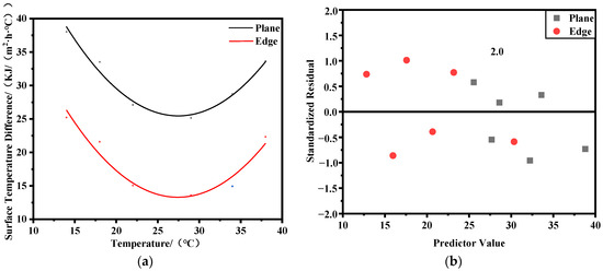 During the above calculation process, under the working conditions of ambient temperatures T = 34 °C and T = 38 °C, the peak internal temperature of the structure without water cooling exceeds 70 °C, which does not meet the design requirements. Therefore, a water cooling scheme is adopted to reduce the peak internal temperature. From Figure 5a, it can be observed that as the surface heat dissipation coefficient decreases, indicating the strengthening of insulation measures, both the maximum temperature difference between the interior and exterior and the excessive tensile stress decrease, consistent with the conclusions of Lin’s study [37]. Based on the curves in Figure 5, reasonable heat dissipation coefficients corresponding to a temperature difference of 25 °C between the interior and exterior, as well as an overstress value of 0 MPa at the edges, are obtained under different ambient temperatures. Mathematical models are established for the relationship between ambient temperature and reasonable heat dissipation coefficients for the plane and edges, revealing a parabolic distribution pattern between reasonable heat dissipation coefficients and ambient temperature. The fitting curves are shown in Figure 6, and the expressions are given in Equation (8). The correlation coefficients R2 for the fitting curves of the plane and edges reach 0.95 and 0.92, respectively, indicating high fitting accuracy. Figure 6b shows the standardized residual graph, with the x-axis representing the predictor values of reasonable heat dissipation coefficients and the y-axis representing the standardized residual values. From Figure 6b, it can be observed that the standardized residuals are distributed around zero, exhibiting a basic symmetrical distribution. The distribution characteristics remain unchanged with an increase in predictor values, indicating conformity with the assumptions of homoscedasticity and independence of data. Moreover, all standardized residuals fall within the range of −2 to 2, indicating that the error terms follow a normal distribution, suggesting a good model fit.