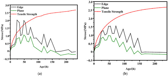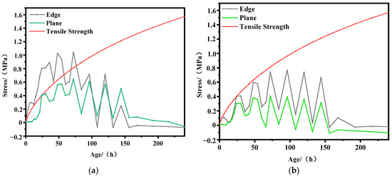 From Figure 7a and Figure 8a, it can be observed that when the surface heat dissipation coefficient is set to the same value as the rational surface heat dissipation coefficient, the tensile stress at the edge significantly exceeds the tensile strength within the age range of 0 to 54 h. Additionally, the maximum exceedance of tensile strength at temperatures of T = 10 °C and T = 43 °C can reach 0.70 MPa and 0.40 MPa, respectively. This indicates a high risk of cracking at the edge during the early age. Meanwhile, the tensile stress at the structural surface remains below the tensile strength. Thus, setting the surface heat dissipation coefficient to the rational surface heat dissipation coefficient can meet the requirement of no cracking at the surface, but cracking may still occur at the edge. If further reinforcement measures are taken to adjust the surface heat dissipation coefficient to the rational edge heat dissipation coefficient, the early-age stress history at the structural surface and edge is shown in Figure 7b and Figure 8b. It can be observed that under both environmental temperatures, the tensile stress at the surface remains below the tensile strength, meeting the anti-cracking requirements. At T = 10 °C, the tensile stress at the edge only exceeds the tensile strength at very few moments, and the magnitude of exceedance is very small. At T = 43 °C, the tensile stress at the edge remains below the tensile strength. This indicates that adjusting the surface heat dissipation coefficient to the rational edge heat dissipation coefficient eliminates the risk of cracking at both the edge and surface, thereby verifying the accuracy of Equation (7).
