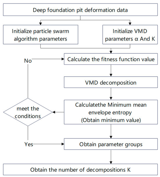 The particle swarm optimization algorithm is used as the parameter optimization algorithm of VMD and GRU, and the PSO-VMD-GRU deep foundation pit deformation prediction model is established. The working flow of the model is shown in Figure 4.
