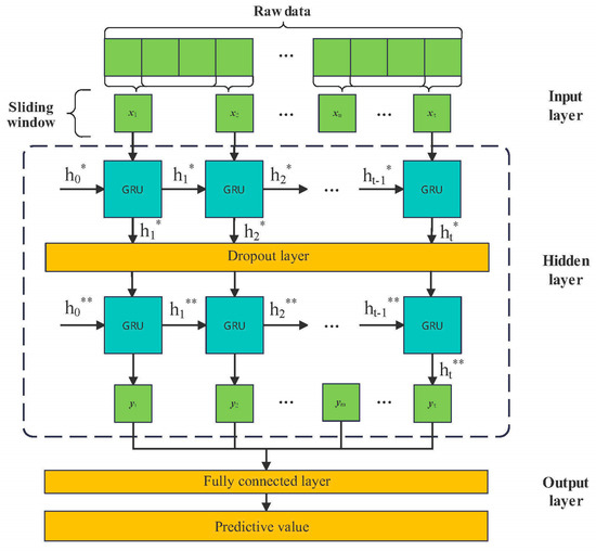 In deep learning, the efficiency and accuracy of the model are affected by the selection of hyperparameters. Generally, in the network structure, the hidden layer is usually composed of the simple stacking of cell structures, but the dependence of large time steps in the sequence is difficult to learn. By increasing the number of layers, the network can have stronger capabilities, but it will bring problems such as the overfitting of the model and too long a training time. The structure of the two-layer GRU network is shown in Figure 3.