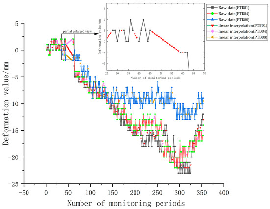In order to verify the feasibility and effectiveness of the proposed method, data from the east side (PTB01), north side (PTB04), and west side (PTB08) of a deep foundation pit project between 26 May 2022 and 15 May 2023 were selected (obtained by equipment such as level and total station, the data collection interval in the article is 1 day). Due to the influence of monitoring technology and on-site conditions, there are some missing values in the monitoring data. The linear interpolation method was used to process the missing values, as shown in Figure 5. The detailed information about the raw data is shown in Table 2.