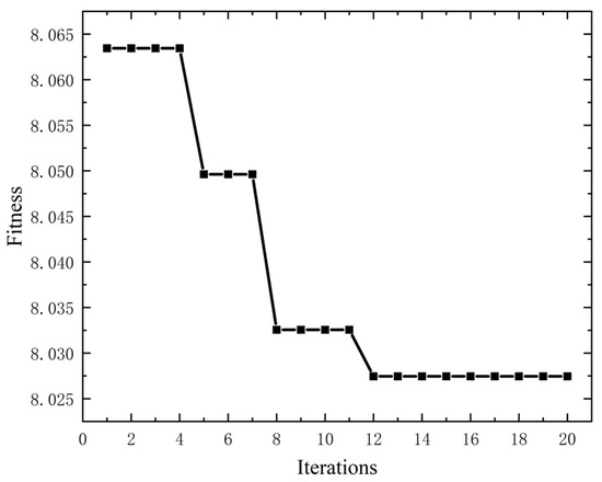 As can be seen from Figure 6, with the increase in decomposition mode , the ratio of the energy difference mutates at , and the optimal decomposition number is eight. However, this method still requires the artificial setting of parameter . In order to make up for the shortcomings in the subjective selection, and in VMD were optimized using the PSO algorithm with the minimum mean envelopment entropy as the fitness function. The fitness function changes at this time are shown in Figure 7.