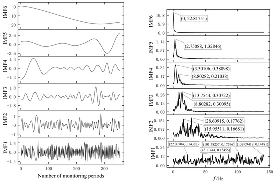 In this way, the values of parameter groups and of VMD are determined to be . The IMF component and the corresponding spectrum obtained from the original data after processing by the PSO-VMD method and EMD method are shown in Figure 8 and Figure 9.