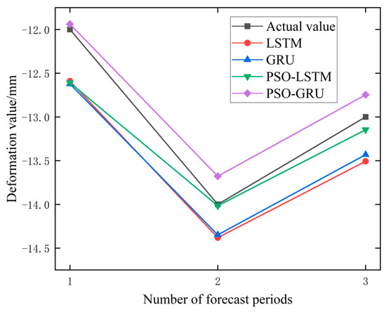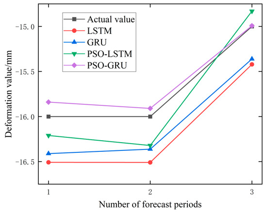 Secondly, according to the prediction results of different observation points, the LSTM and GRU models optimized by the PSO algorithm have improved the prediction accuracy compared with the single model. Compared with the single model, the prediction errors of PSO-LSTM decreased by 13.7% and 2.1%, respectively, at different monitoring points, and that of PSO-GRU decreased by 75.9% and 85.2%, respectively, at different monitoring points.