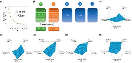 The application of K-means on MP databases: (a) the line chart of loss for K-class; (b) the classification data and relaxation screening results of the initial structures under K-means; (c–g) the average distribution of 5 features for each K-means class.