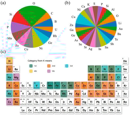 The material data collected from the MP database are finally divided into five categories using the K-means method. We identified the elements which are contained in the compounds of every class, and selected those larger than 5% of the total materials in number. For instance, in the first class, there are 6602 materials, if some element contained more than 330 (6602 × 5%) materials, we picked it out. As shown in Figure 2a, the first class of materials are mainly contributed by O, Si, P, Mn, Fe, Co, Ni, Ge, Rh, U, B, C, etc. In the second class, the materials are mainly composed of the III, IV, V, and VI main groups, with the alkali and alkaline-earth metals. In the sets of elements in the first and especially second class, the main group elements of III, IV, V, and VI are the habitats of many known semiconductors, suggesting the possible existence of excellent thermoelectric materials. Compared with the first and second class, many compounds in the third one are contributed by the halogen elements (such as F, Cl), and many of them take perovskite structures (such as CsPbCl3, CsGeCl3, etc.). The appearance of the H element in the fourth category indicates the presence of many hydrides and even organic compounds. And the fifth category has added Cs and Mg elements, most of which have larger bandgaps. By using the K-means method to classify the raw data for the first time, we can select the material dataset that needs to be calculated, which could help to reduce the calculation time.