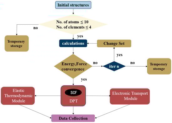 For the first and second classes of materials obtained through K-means initial screening, there were more than 12,000 materials, many of which contained too many element classes and numbers of atoms in the primitive cell. In the present work, we firstly calculated the material system with a relatively simple structure. Therefore, a computational control process was employed during the structural relaxation to further screen them, resulting in a total of more than 3000 materials with relatively simple structures in the first and second classes. Nevertheless, conducting structural relaxation for so many materials was a computationally demanding task. In order to accelerate the calculation, we wrote several shell scripts to control the process of structural relaxation. The flowchart is shown in Figure 3.