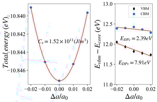 The deformation potential method considered acoustic phonons as the main scattering sources for electrons. The relaxation time obtained by ignoring the contributions of optical phonon branches and other scattering mechanisms could be larger than the real one, but the calculation of deformation potential is relatively simple, easily employed in high-throughput calculations. The coefficients for applying deformation to the lattice vector are {0.98, 0.99, 1.00, 1.01, 1.02} of relaxed volumes, respectively. Such calculations could ensure the reliability of fitting with the second-order function for the elastic constant and the first-order function for the elastic potential energy. We took Si as an example, as shown in Figure 4.