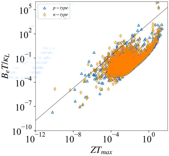 where . As shown in Figure 8, the values of most materials are positively correlated to the electronic quality factor of , so the values could also serve as another criterion for judging the performance of a thermoelectric material.
