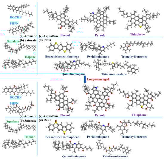 Asphalt binder, characterized by a complex and varied array of hydrocarbons, presents challenges in precisely determining its chemical structure due to its intricate composition. In this study, the AAA-1 asphalt binder model [44], including saturates, aromatics, resins, and asphaltenes (SARAs), was utilized and assembled using the amorphous module in Materials Studio (MS) 2020 software [45]. In previous studies, Fourier transform infrared spectroscopy (FTIR) analysis revealed that carbonyl and sulfoxide groups emerge as characteristic functional groups in asphalt binder following the aging process [46,47,48]. Therefore, the model for long-term aged asphalt was represented by a fully oxidized version of the 12 component model [49]. The detailed molecular models are shown in Figure 1.