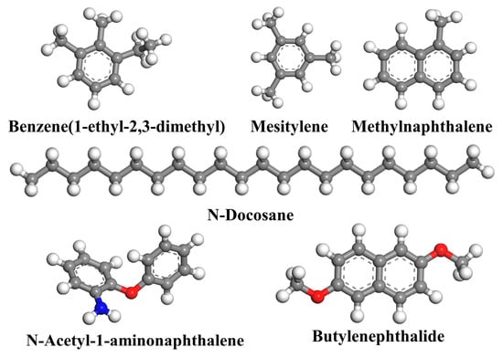 By conducting a gas chromatograph mass spectrometry (GC–MS) test and gel permeation chromatography (GPC) test, the detailed components of WEO proposed by Liu et al. [15], excluding any metal impurities, are listed in Table 2. The WEO molecular model is shown in Figure 2.